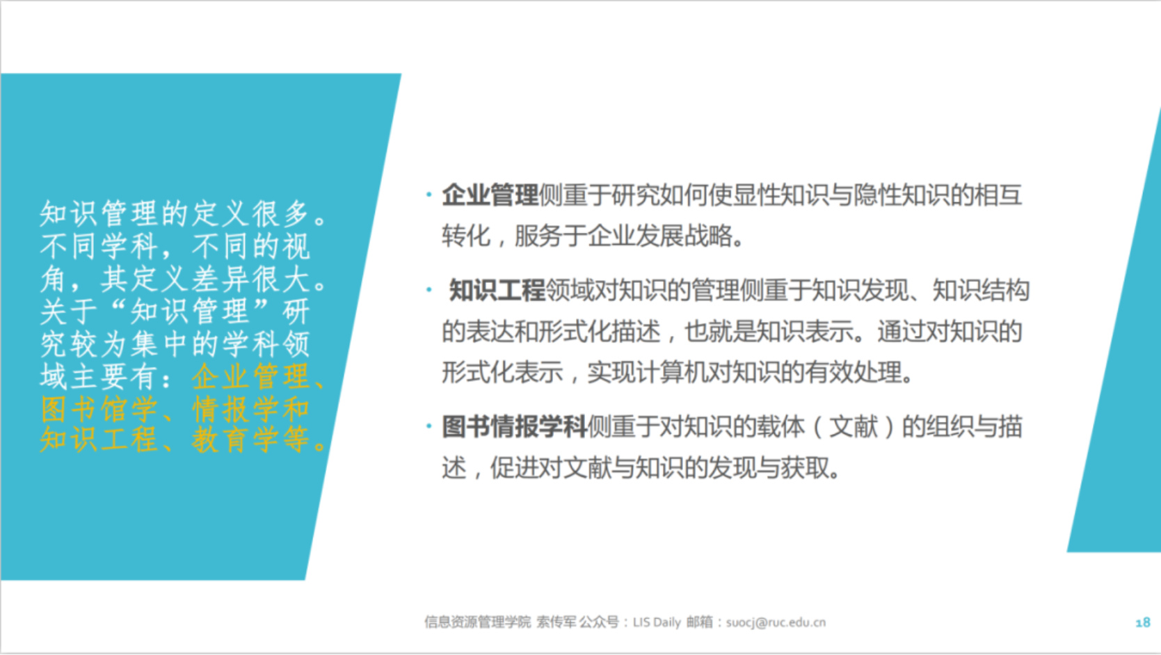 本次讲座主要从文献、信息和数据三个不同时代,结合信息资源管理的相关二级学科,一方面讲述知识管理的发展和变迁,另一方面讲述本学科的核心知识体系与专业技能。同时,立足于当前数据智能时代知识管理领域存在的重大问题,通过具体事例讲述一些亟待探究的新领域、新方向。