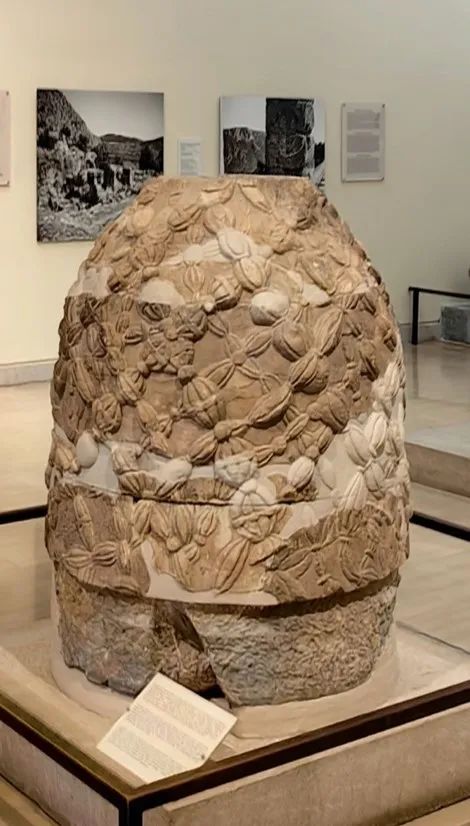 翁法罗斯圣石(Omphalos)是神谕所中最著名的物件,它被看作是“大地的肚脐”。据古罗马作家马库斯·瓦罗记载,“希腊人所称的翁法罗斯石是一块安放在德尔菲神庙旁边的石头,形状如宝库;他们说那是皮同的坟墓。”英国学者赫丽生结合古代记载,以及对照“阿特柔斯宝库”,认为圣石是“树立在坟墓上的锥形石”,具有巫术的意义,它蕴蓄着来自大地母亲的生命之力,关联着在德尔菲更为古老的盖亚崇拜。在古代的农人眼中,大地母亲盖亚拥有着强大的力量,既能产生、哺育生命,也能诅咒、剥夺生命,他们崇拜一种被称作“阿癸伊欧斯柱”的神圣之物,以祈求大地的丰产。阿波罗斩杀了地母的孩子皮同,净化了来自大地的邪恶力量,于是,生命之柱变成了光明之柱,树立在坟墓上的、古老的象征丰产的圆锥形神石,获得了纯洁的福玻斯的净化之力,使得生命免受病痛之苦。当俄瑞斯忒斯仓皇逃到德尔菲,抱着圣石瑟瑟发抖,或许便在期待一种净化与新生。