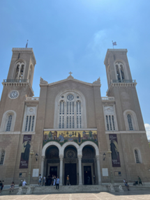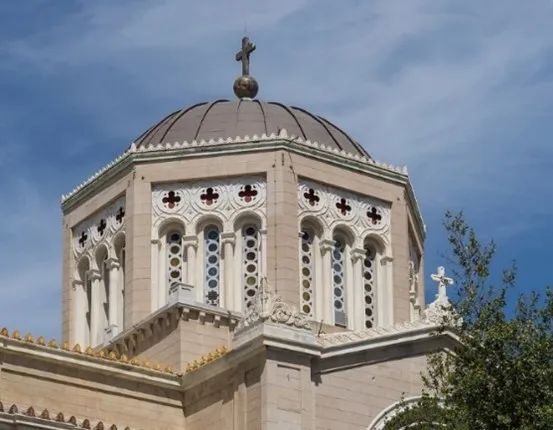 雅典大都会天使报喜主教座堂,1842年由国王奥托和王后阿玛丽亚奠基,历时20年建成,是东正教希腊教区最重要的教堂。这是一座标准的三厅(前庭,中殿,祭坛)的教堂,有着东正教的重要标志——带十字架的圆顶。在东正教传统中,教堂只可以有1—3、5、7、9、13、24—25、33个穹顶,这些数字分别有着不同的符号学意义。而标准的东正十字,也比天主教的十字在头部和脚部多了两横。