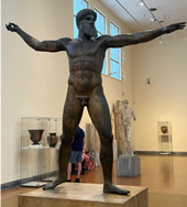 笔者认为,该雕像为海神波塞冬的几率更大一些,因为他的后臂伸展程度更大,更像是往高处和远处去投掷武器。而结合同时期出土的其他宙斯青铜像,以及叙利亚巴勒斯坦地区出土的公元前14-13世纪的迦主神风暴之神巴力的雕像,可以发现,这两位掌管雷霆的主神,右前臂与后臂之间约呈直角,稍有前倾之势,左前臂略下垂,这更符合从云端向下投掷闪电的动作,而古代文献中也有很多宙斯从云中霹下来一道闪电的记载。这个雕像中的动作幅度很大,看上去并不像从云中或山上往下投掷,而闪电很少会有从低处往上霹的,因此,笔者认为,这尊雕像表现的是即将投掷三叉戟的海神波塞冬。(当然,反对的理由主要有:三叉戟要比闪电长,从侧面看可能会遮挡脸部,而根据同时期的硬币与瓶画,古希腊人不会这么做;瓶画上的波塞冬表现的更多是击剑或向前冲刺的动作,三叉戟似乎并不用来投掷。)