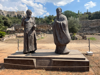 阿卡德米学园或许是西方世界最早的、最有名的公共教育机构之一。希腊各邦的学生(主要还是雅典的富家子弟)来到这里,他们可以免费求学,且能寄宿于此。课堂氛围较为轻松,老师坐在中间讲课,学生们围坐一圈,聆听或者提问。教室旁边还有炉灶,或许是为了帮助路远的学生,而在美食飘香的氛围中探讨哲学,或许也是一种双重的享受。古希腊人讲究交流时的坦诚相对,而公共浴场的设置便能满足这个需求。这里还有体育场,用来强身健体,培养竞技意识,据说,柏拉图本人也是摔跤好手,并因自己宽阔的胸膛与健硕的双肩而得名“柏拉图”(意为宽阔、平坦)。学生们可以在这里学到哲学、数学、物理学等知识。而比知识更重要的,或许是一种理性思考的能力,与质疑权威的勇气,以及,与师友们交流的乐趣。或许,对于柏拉图而言,这所学园也是一个乌托邦,他在这里自由地思考、写作,将他的理念传播出去,实践着培育哲学王的理想。
