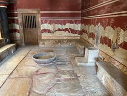 宫殿西侧有一间是著名的“王座室”(Throne Room)。石制的王座被放置在房间一侧的中央,其两侧皆是石制的长椅,房间正中摆放着一个石制的盆,一些贮存橄榄油的瓶瓶罐罐也曾被放在这里。挖掘者伊文思认为这里应是克诺索斯王举行祭祀的场所,石座属于国王,石盆则是举行某种祛邪仪式所用到的器具。后来的考古学家部分认可了这一观点,但他们结合陶器、壁画中的女神形象,以及克里特文明的母系传统,推论出祭祀的主体应为女祭司们。