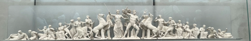 帕特农神庙大殿的石柱上方的饰带独具特色,它全长160米,从西面向南、北两侧延伸,最终在东面会合,呈现了一幅描绘古代泛雅典娜节的各项仪式活动的长卷。在古希腊,雅典人每年在7、8月间(古希腊的岁首)为雅典娜女神庆祝生日,而公元前566年改为每四年举行一次规模更大的庆典,即泛雅典娜节。节日由一场通宵的庆典拉开序幕,赛跑者们手持火炬,竞相去点燃圣坛中的火焰。家家户户在空旷的场地上点起油灯,灯火整夜燃烧着,人们穿着盔甲跳舞,庆祝雅典娜在提坦之战中的胜利。白天还会有一场盛大的游行,人们从雅典的郊区出发,经过市政广场,登上卫城,途经帕特农神庙和伊瑞克提翁神庙中间,再从正殿进入帕特农神庙,向雅典娜女神敬献一件刺绣精美的长袍,长袍上往往绘有诸神与巨人战斗的场面。在《伊利亚特》中,特洛伊王后赫卡柏向雅典娜献上了一件灿若星斗的长袍,并由女祭司将其放在帕拉斯女神像的膝盖上。这座神像是由天上掉下来的神赐的礼物,是特洛伊的守护圣像,而后来被奥德修斯和狄俄墨德斯盗走。据传,供奉在伊瑞克提翁神庙里那座橄榄木制的小型雕像,即是希腊联军从特洛伊带回来的城市的守护圣像,人们每四年向其献上一件新的长袍。(罗马人则称,希腊人带走的是假货,真正的神像则被埃涅阿斯带到了意大利。)除此之外,泛雅典娜节还会开展体育竞技会,诗歌与音乐比赛等。