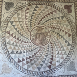地面马赛克由平滑的天然鹅卵石制成,主要以黑色为底色,白色作点缀,嵌板上装饰有几何图形或人像,嵌板周围则点缀着不同的纹样,比如植物或花卉的图案,有些画中还刻有铭文。现存希腊世界最早的地面马赛克画可追溯到公元前5世纪。希腊化时代以来,鹅卵石马赛克逐渐被棋盘格马赛克所取代,它们大多采用修整过的小石块或方砖来进行制作,图案多为抽象图案,有些作品则带有精美的呈小方块状的中央嵌板,这些嵌板多为黑色、白色,也有彩色的。图中则是帕特拉斯出土的古罗马时期的马赛克,它们颜色多样,古朴而独具质感,其内容多涉及神话故事,有时也表现人们的日常生活。
